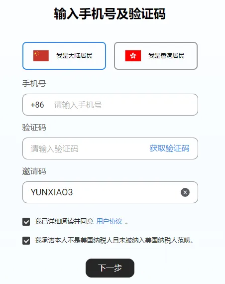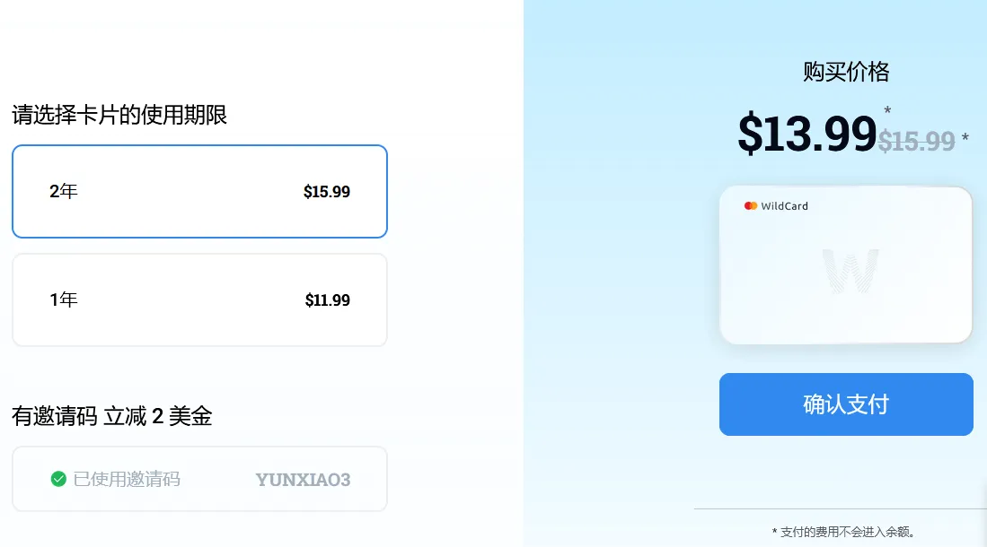 - 使用本链接访问 野卡,系统会自动填入我的邀请码 ACCPAY,如果没有自动填入,可以手动输入以节省 2 美元。