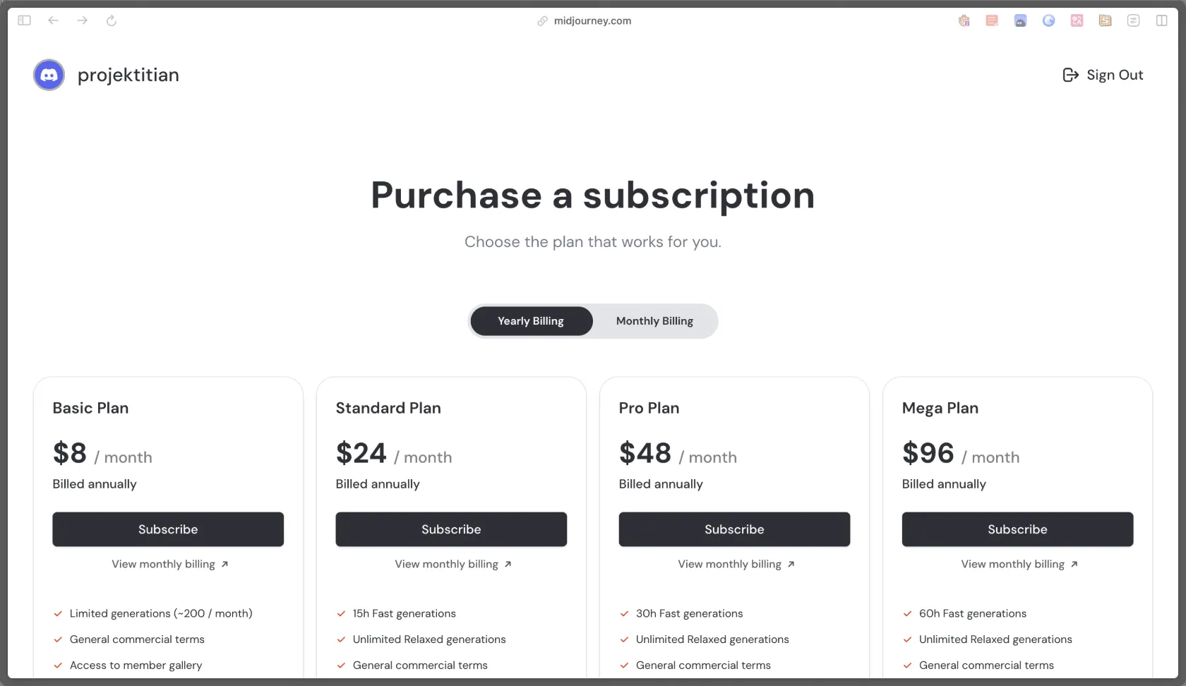 在选择合适的订阅计划后,点击计划下方的“Subscribe”按钮进入付款流程。Midjourney 支持使用 Visa、Mastercard 等信用卡,或者支付宝支付,方便用户选择。